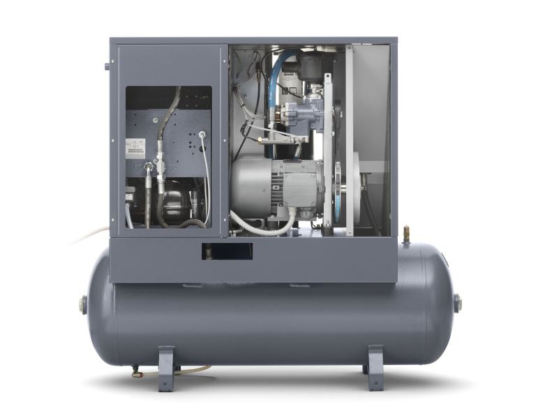 Schraubenkompressor: Vollautomatische, intern komplett verrohrte und verdrahtete Kompaktanlage, einstufig, öleingespritzt verdichtend, luftgekühlt, schallgedämpft, auf einem liegenden innenbeschichteten AD2000 Behälter aufgebaut.