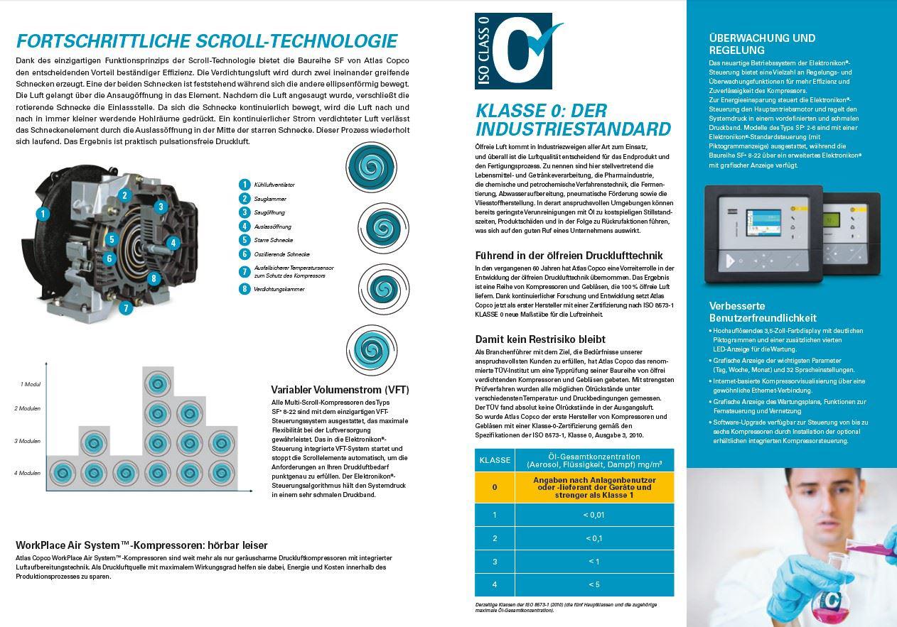 Ölfrei verdichtender SF-Scrollkompressor SF 6 FF mit integriertem Kältetrockner - Diese nach ISO 8573-1 Klasse 0 zertifizierten Kompressoren liefern 100 % ölfreie Druckluft, unkompliziert im Betrieb, sind leicht zu warten und können platzsparend installiert werden. SF-Kompressoren verhindern eine Verunreinigung mit Öl und sind eine effiziente, zuverlässige und äußerst kosteneffektive Quelle reiner, ölfreier Luft.